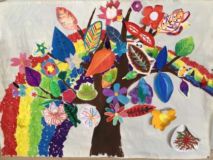 3年生のホームベース入口には、にじいろの木が掲示してあります!3年生の学級開きで虹をみんなで作りました。