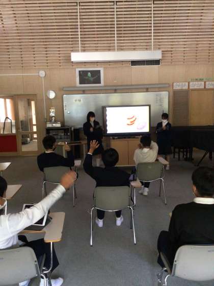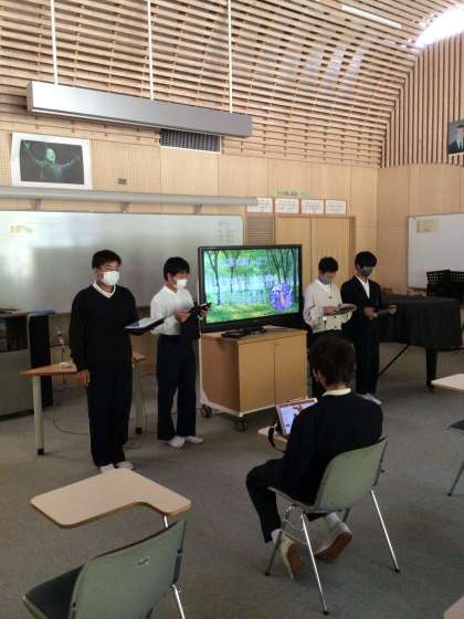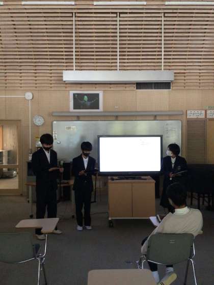 自分たちでまとめたパワーポイントで、発表する練習をしています。