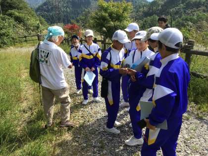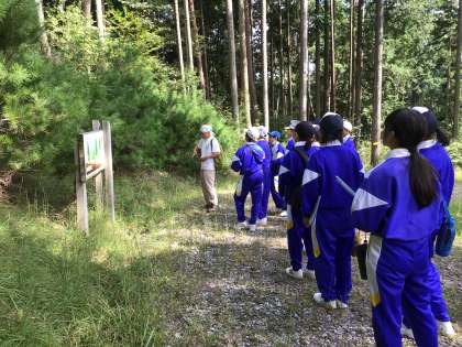 旭高原元気村の「水源の森」で間伐実施前後の森林の植生植物について専門家の先生に説明していただきました。