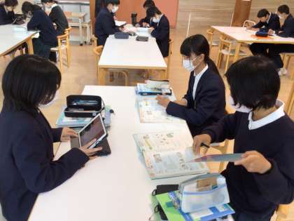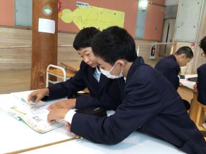 英語の授業を1、3年が合同で行っています。しりとりなどをしました!