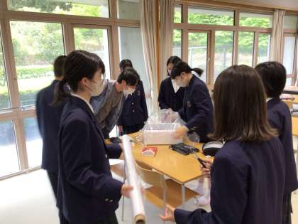2年生が育てているハラペーニョが発芽しました。保温マルチを作っています。