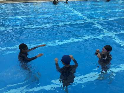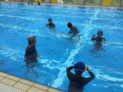 本日も水泳の授業を行いました。気温27度、水温27度、プール日和です。生徒同士でクロールの泳ぎ方を教え合っていました。
