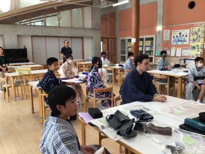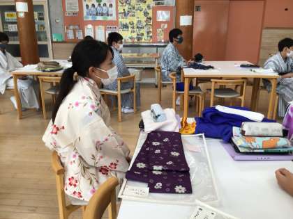 1年生は家庭科で浴衣を着ました!ALTの先生とも英語で着物の表現を学びました!