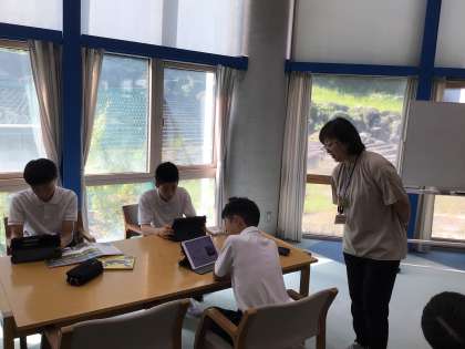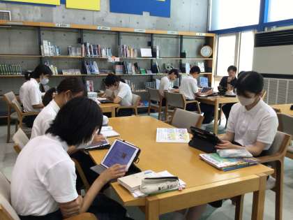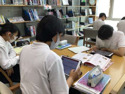 図書館で英語の授業を行なっています!司書さんから参考文献の書き方を聞いています!
