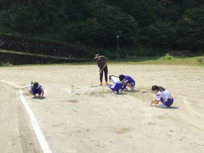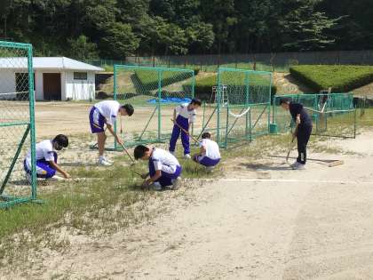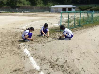 体育祭に向けて運動場をキレイにしています。暑いですが旭中全員で頑張っています!