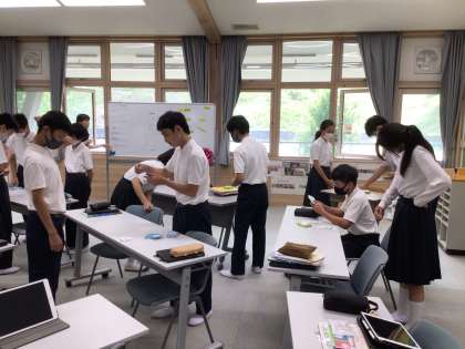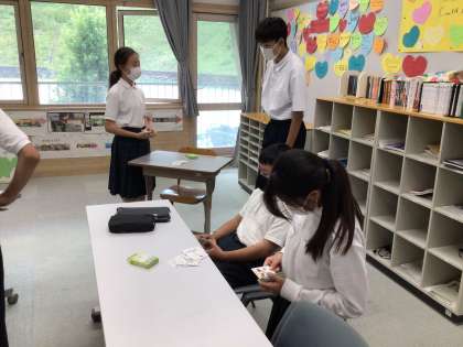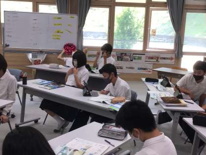 授業の様子です。カードゲームを使って様々な質問を出し合ったり、教科書本文の読み方を練習しています。