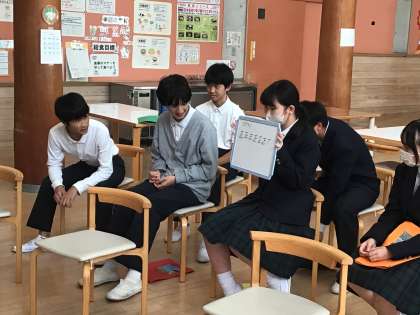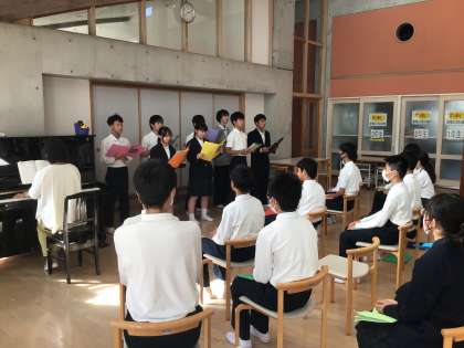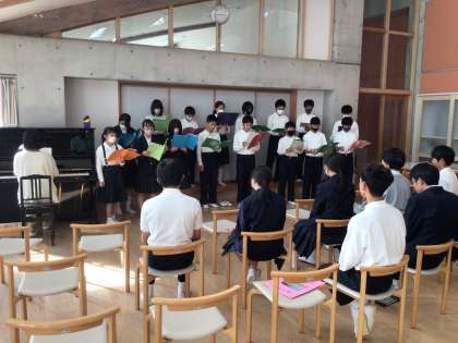3年生と1年生が合唱曲を歌い合いました。3年生から1年生にアドバイスをする姿もみられました。