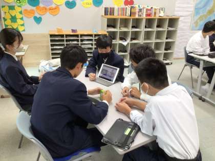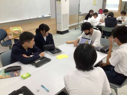 それぞれ作ってきた資料を用いて英語で紹介をしています。