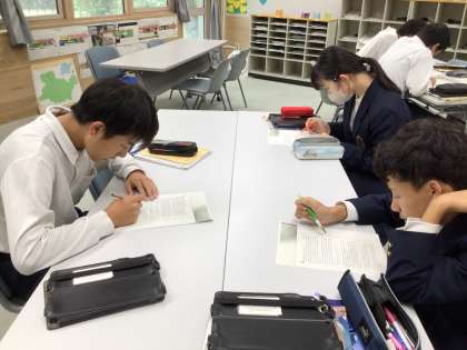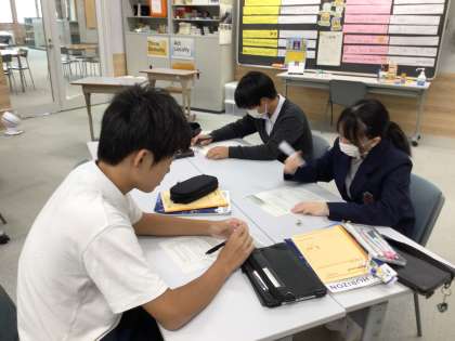 3年生は入試対策として、長文英語問題を解いています。グループで教え合いながら解いています。