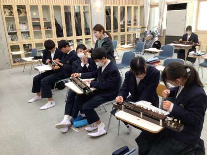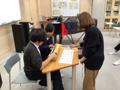 大正琴を体験させていただきました。クリスマスシーズンに合わせて「ジングルベル」を2つのパートに分かれて演奏しました。とても楽しかったですね!