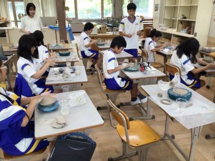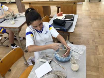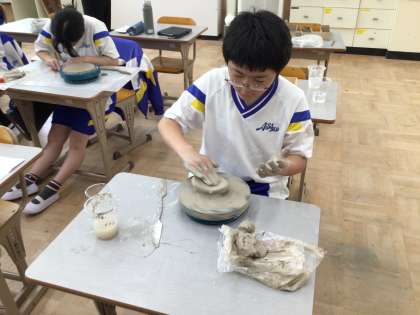 粘土で作品を作っています。回る台座を使って本格的な陶芸のようですね!