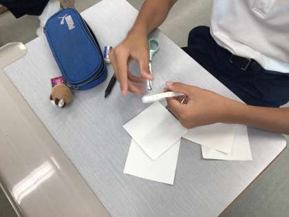 それぞれ長さを決めて箱を作り、体積や面積を求めました。