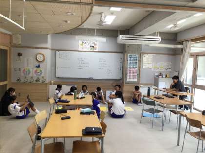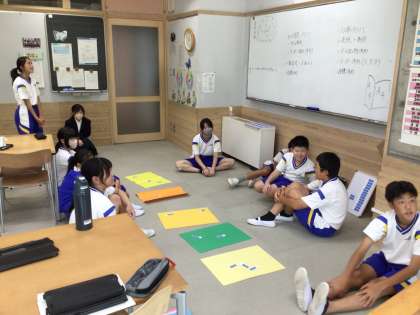 文化祭で歌う合唱曲の楽譜作りをしています。表紙のカラーを選ぶために、学年のイメージカラーや行事への思いを話し合って決めています。