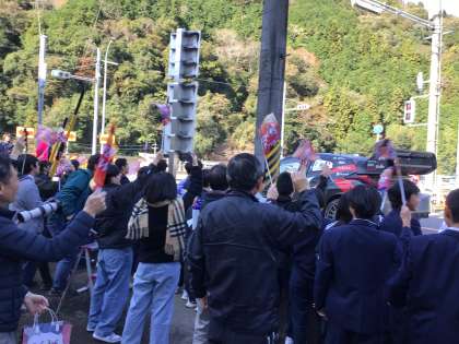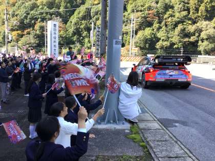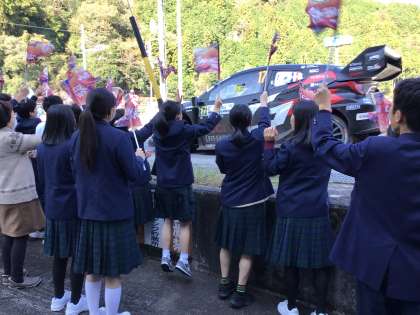 ラリーの応援に行きました!全校みんなで旗を振って声援を送りました。