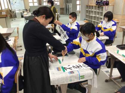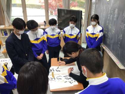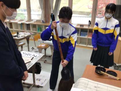 講師の方に書写指導をしてもらいました!大きな筆も実際に持たせていただきました!