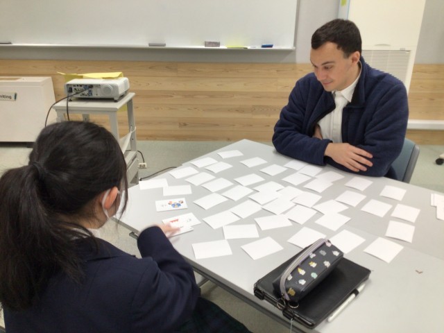 英語科の授業では、カードをつかって英単語を覚える活動をしています!ALTの先生と対戦中です!