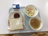 今日の献立はハンバーグ、パン、サラダ、スープでした。1年生も配膳が早くなってきま...