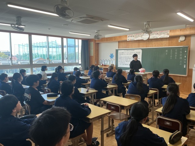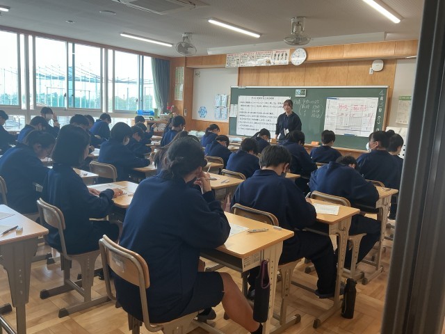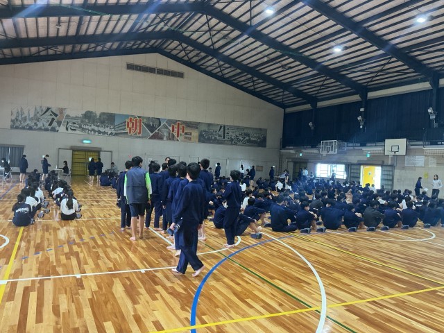 1年生の学年集会の様子です。クイズ形式で中学校について学びました。