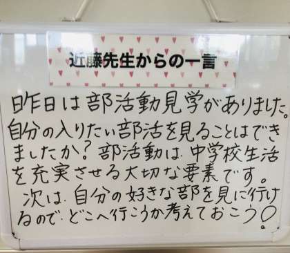 4/20(水)学年黒板より 公開日 2022/04/20 更新日 2022/04/20 各学年から 1年生の学年黒板からです。 昨日、部活動の見学を行いました。 次回は、自分の好きな部活動を見学するということとなっています。 迷っている人は、どの部活動に見学に行くのかを決めなければなりませんね。 1年
