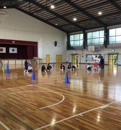 体育館での授業です。 1、2、3学級が授業を受けています。