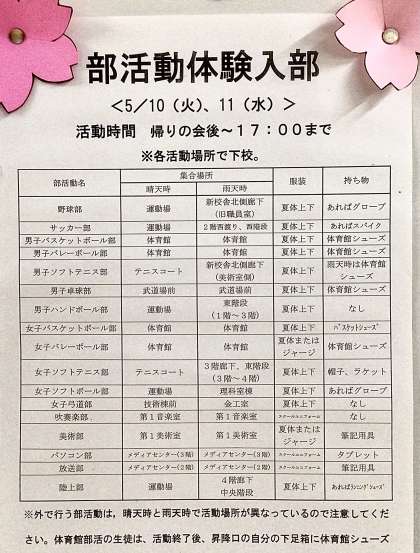 本日の最終下校時刻  部活動体験入部及び部活動参加者 17時15分