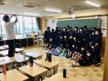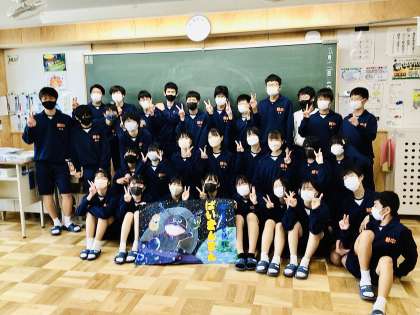 3年4組が学級写真を撮っていました。 学級旗を前にして・・・