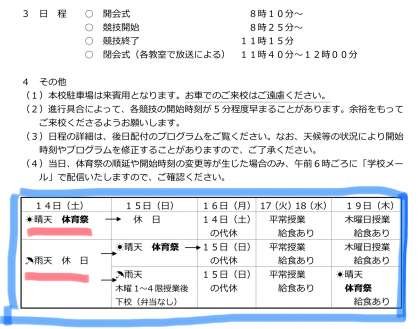 (生徒会の生徒など、体育祭等の準備をする生徒が一部残ります。最終は、15時30分です。)