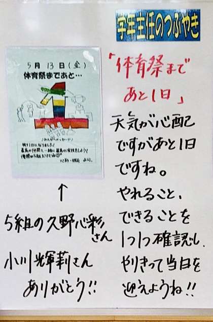 5/13(金)2年学年掲示板より 公開日 2022/05/13 更新日 2022/05/13 各学年から 今まで、たくさんの生徒がカウントダウンのカレンダーに携わることができました。 協力ありがとうございました。 2年