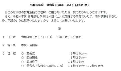 明日行う予定であった、体育祭を明後日、日曜日に延期します。