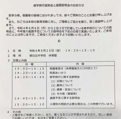 本日 修学旅行説明会及び進路説明会が午後2時20分より行います。午後2時より保護者の受付を開始いたします。3年生の保護者の皆様 よろしくお願いします。