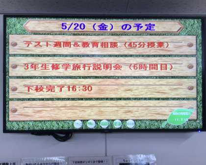 5/20(金)1、2、3学級の朝の活動の様子 公開日 2022/05/20 更新日 2022/05/20 各学年から 朝の活動の様子です。 1番下の写真は、昇降口付近のモニターです。本日の予定が示されています。 特別支援学級