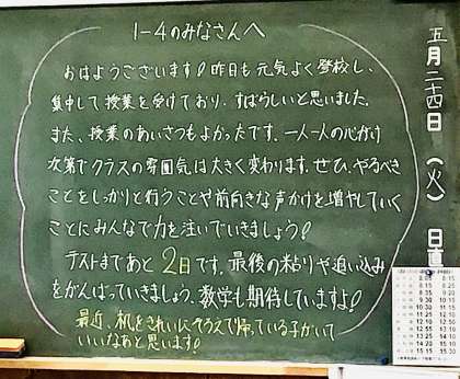5/24(火)今日の黒板メッセージ 公開日 2022/05/24 更新日 2022/05/24 各学年から 1年生の教室からです。 温かな黒板メッセージ 生徒の良さを見つけるメッセージ 今日は、どんな良いところを見せてくれるだろう という先生の機体が滲み出てきますね。