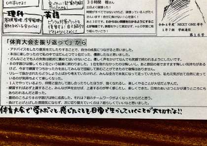 5/24(火)学年通信より 公開日 2022/05/24 更新日 2022/05/24 校長室から 不意に机の上に乗っていた学級通信の一部より 皆、体育祭で、いろんな事を学んだのだなと 大変嬉しくなりました。 体育祭で学べることは多いですね。 1年生の皆さんが、このような感想をもってくれていることが、とても嬉しいです。 1年