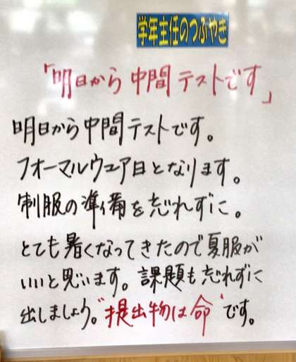 5/25(水)2年生学年黒板より 公開日 2022/05/25 更新日 2022/05/25 各学年から 明日は、テスト日 つまり、朝中フォーアルウエアー日です。 ご用意をお願いいたします。 課題の提出も大切ですね。 2年