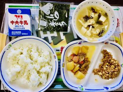 5/27(金)今日の給食! 公開日 2022/05/27 更新日 2022/05/27 校長室から 今日の給食は、 ⭐️肉じゃが ✳️納豆 ⭐️手巻きのり ✳️ご飯と牛乳 ⭐️麦味噌汁 でした。 納豆巻きにして食べましたね。