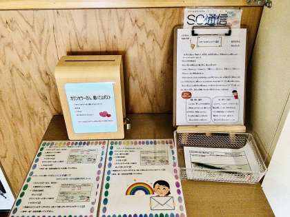 生徒昇降口付近の中央階段付近には、スクールカウンセラーさん。聞いてよ相談箱が設置してあり、生徒の相談を幅広く受け入ています。。