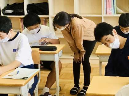 教師が机間指導を行いつつ、授業が進めています。