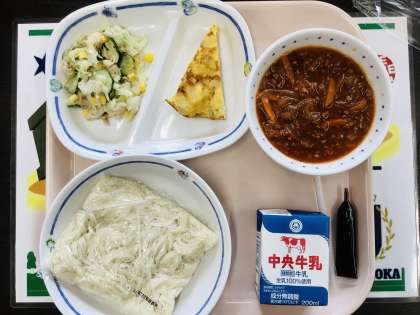 6/16(木)今日の給食は! 公開日 2022/06/16 更新日 2022/06/16 各学年から 今日の給食は、 ✳️スパニッシュオムレツ ⭐️ツナサラダ ✳️コーヒー牛乳のもと ⭐️豊田めん ✳️牛乳です。 トマトソースかけにして食べました。 明日は愛知を食べる学校給食の日です。 トヨタひまわりポーク丼です。楽しみですね。