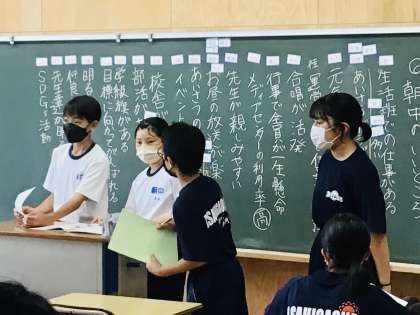 6/21(火)短学活学級会議の様子4 公開日 2022/06/21 更新日 2022/06/21 特別活動 朝中 全体として、生徒会が主体となって、全校での取組です。 なかなか、このような全校での取組を行っている学校はないと思います。 このようにたくさんの意見が出ました。 1年生の様子です。 1年