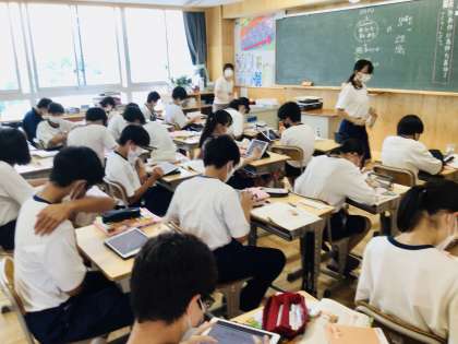 7/15(金)3時間目2年生の授業2 Qubena 公開日 2022/07/15 更新日 2022/07/15 各学年から 5組の授業を見てみましょう。 国語の授業です。 新しいタブレットのAI学習ソフト Qubena を使った個別最適な学習を進めています。 2年