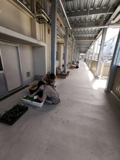 7月23日、朝からお天気に恵まれ、たくさんの親子が参加しました。作業内容は卒業式や入学式を華やかに彩るサクラ草の苗の植え替えです。初めて行う方が多く、公務手さんから説明を受けて活動をしました。