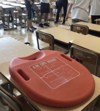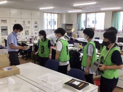8/25(木)重大事故シミュレーション研修9 公開日 2022/08/25 更新日 2022/08/25 学校の特色ある活動 教室で給食中にアナフィラキシーショック症状を起こした場合について、救急隊員に引き渡すまっでの対応実施訓練を行いました。 係に分かれて、分かりやすいようにゼッケンをつけました。 特色ある活動