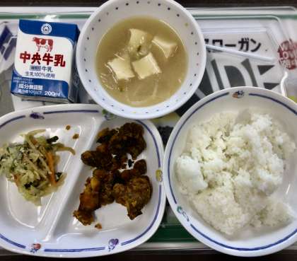 今日の給食は、 ☆レバーとかぼちゃの甘辛煮 ☆アーモンドあえ ☆麦みそ汁 ☆ごはん・飲用牛乳でした。