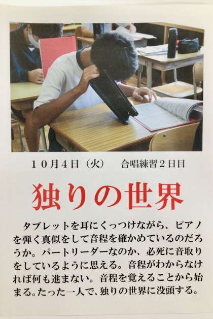 合唱が始まりました。朝、そして休み時間に合唱の練習や歌声を創るためにタブレットに入った音源を聞く姿などが見られます。