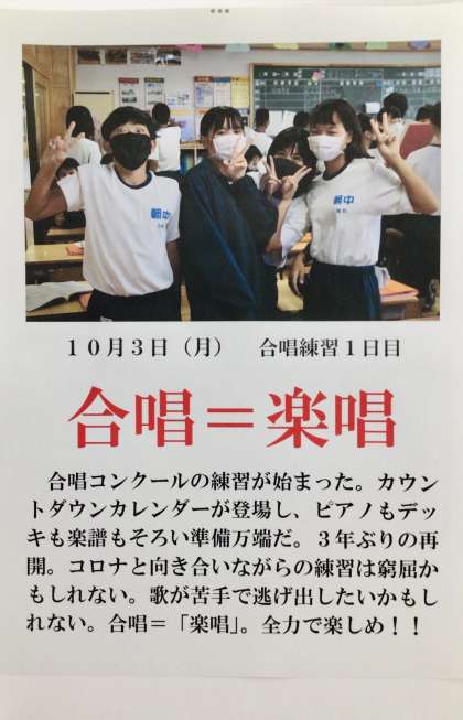 1年生から3年生まで、830名が中学校での合唱コンクールを経験しておりません。