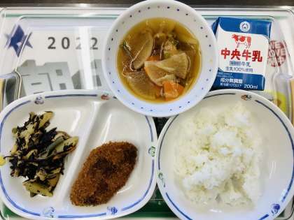 今日の給食は、豆腐しんじょ、おひたし、牛乳、ごはん、根菜の旨煮です。
