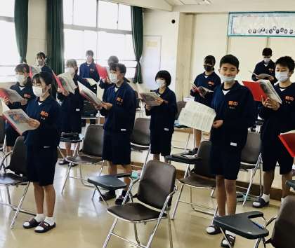 10/12(水)2年生音楽科の授業2 公開日 2022/10/12 更新日 2022/10/12 各学年から 学級担任の先生が一緒に練習に参加しています。朝中の先生は、自分の時間が空いていれば、こうやって、生徒とともに歌の練習に参加をしています。 2年