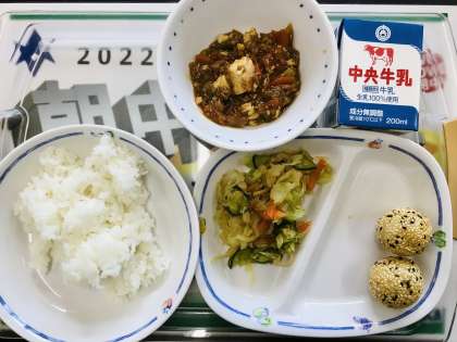 今日の給食は、中華あえ、黒ゴマ団子と麻婆豆腐でした。