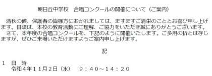 ております。つきましては、下記のとおりアンケートを生徒を通して、本日配付をいたしました。ご確認ください。