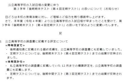 R4 3年第4回(後期期末)テストの変更通知